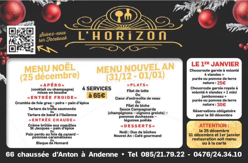 L'horizon huy est un restaurant situé en bord de Meuse à Huy, en Belgique. Fondé par des passionnés de bonne cuisine, notre établissement propose une cuisine raffinée élaborée avec des produits frais et locaux. Nous mettons un point d'honneur à offrir à nos clients une expérience culinaire unique et mémorable, dans un cadre convivial et chaleureux. Notre équipe dévouée est à votre service pour vous faire découvrir des plats savoureux et innovants, tout en vous garantissant un service de qualité. Que ce soit pour un déjeuner d'affaires, un dîner romantique ou une soirée entre amis, l'horizon huy est le lieu idéal pour savourer des moments gourmands et agréables.